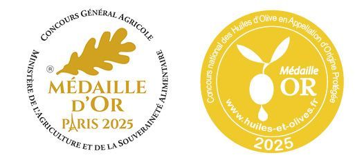 Deux Médailles d'or au Concours Général Agricole 2025 pour nos 2 AOP, Fruité Vert et Noir d'Olives Maturées ! Une d'Or et une d'Argent au concours des huiles en AOP de Nyons